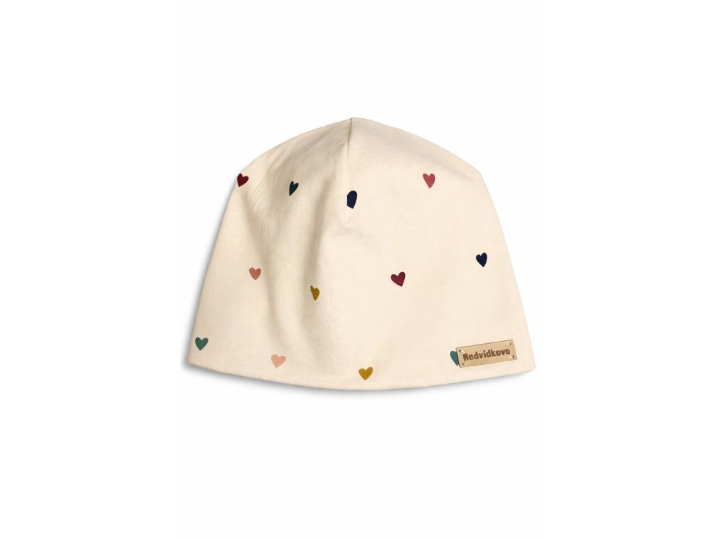 Vnější strana čepice je v krémové barvě s barevnými srdíčky, vnitřní strana čepice je v barvě krémové.