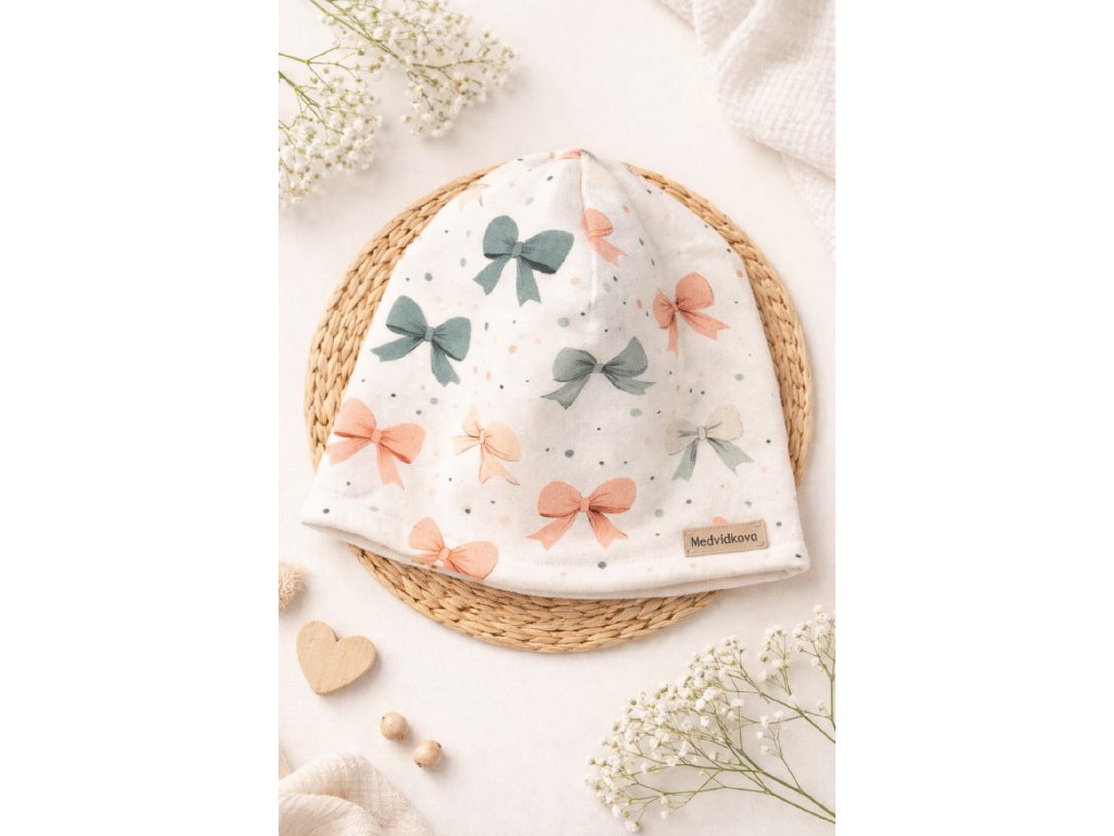 Stylová a pohodlná dětská čepice Little Bows s puntíčky a mašličkami z měkké bavlny, ideální pro jarní a podzimní dny.