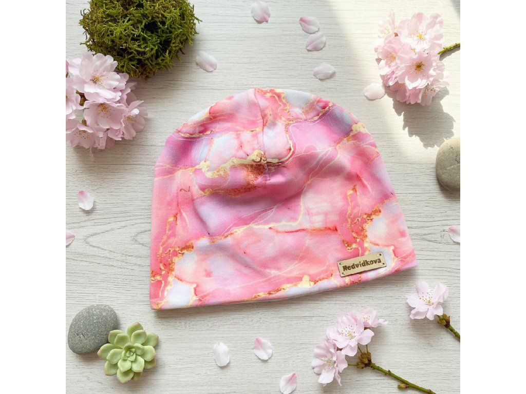 Stylová a pohodlná dětská čepice Mramor Pink z měkké bavlny, ideální pro jarní a podzimní dny.